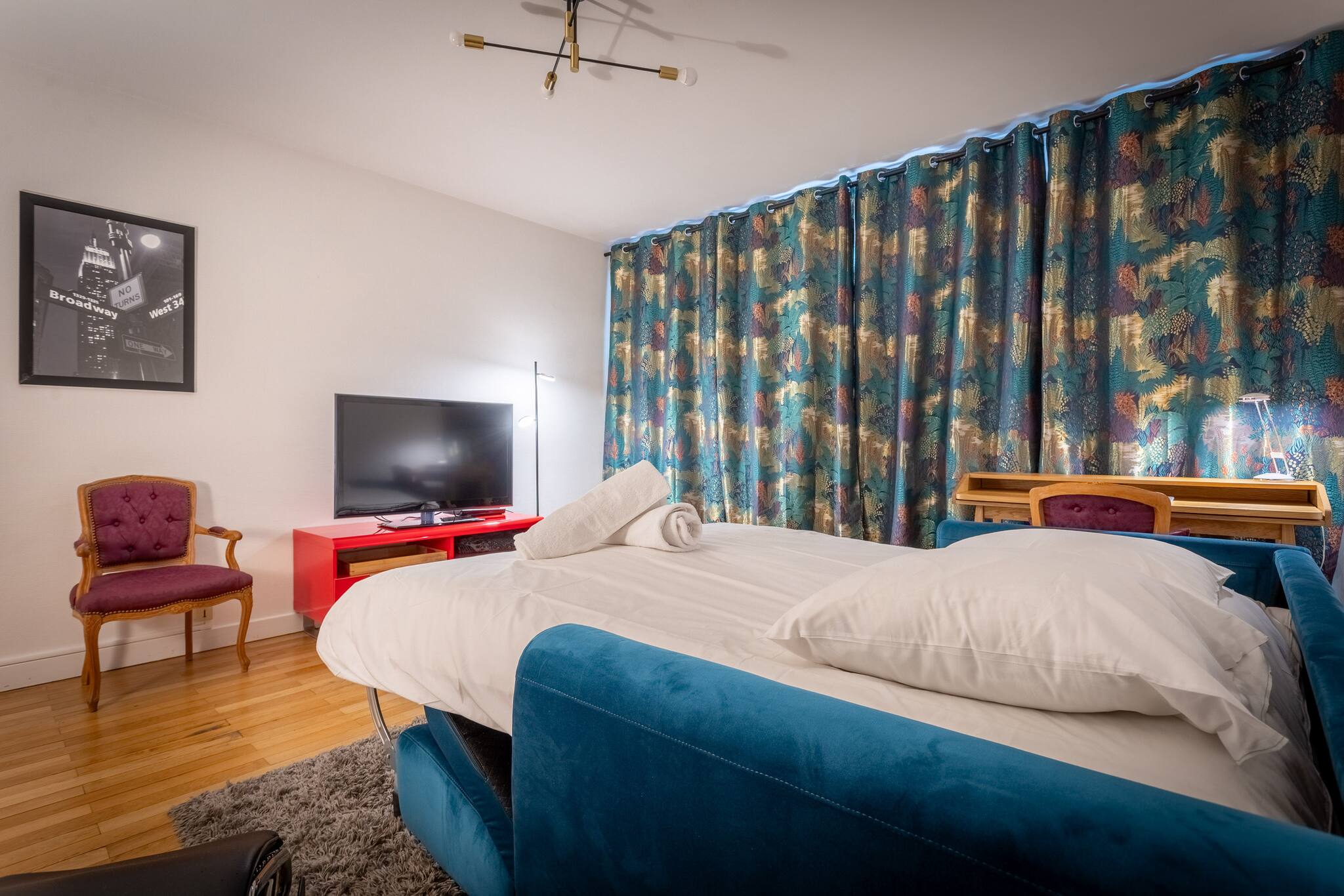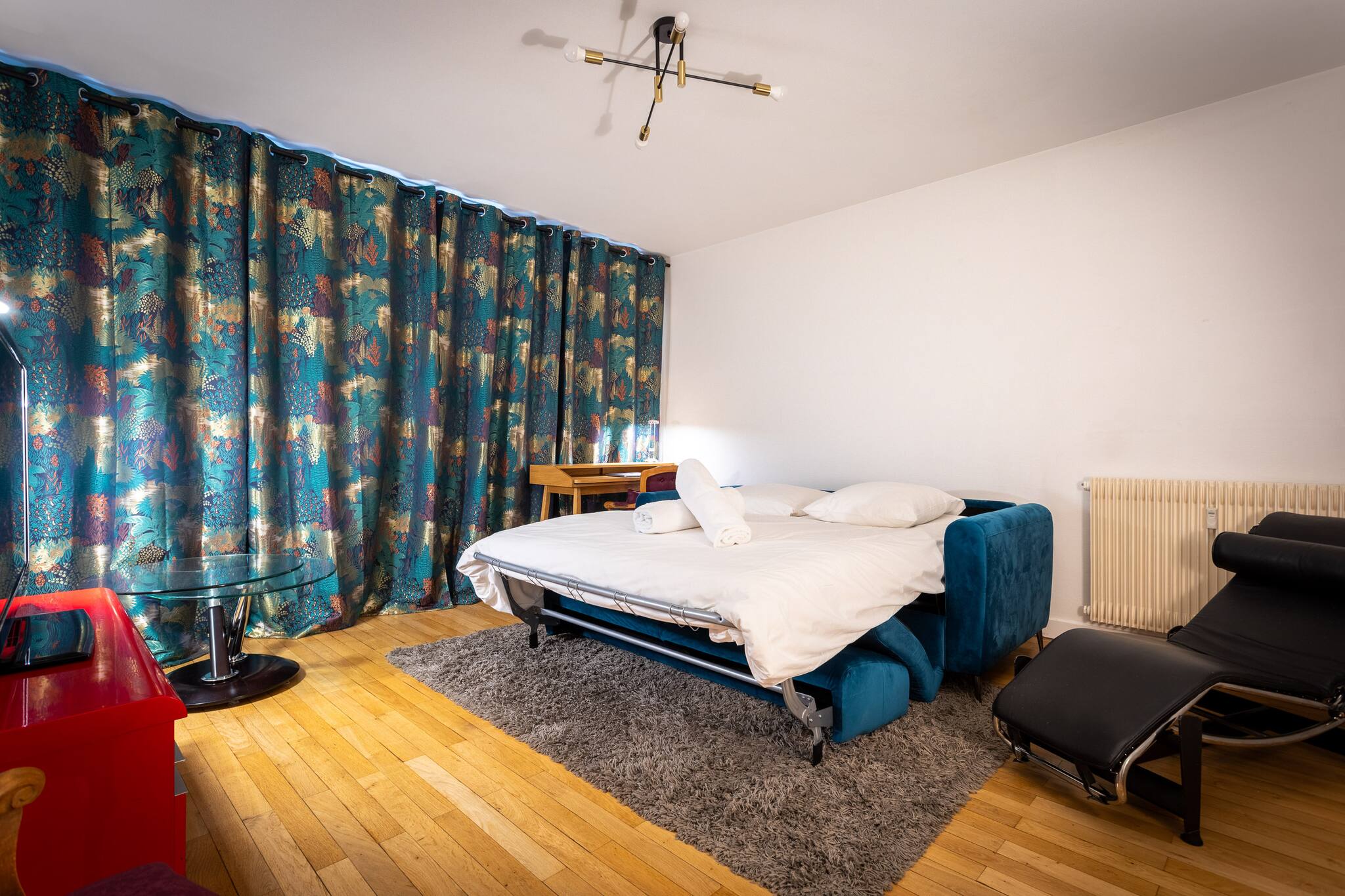 Le logement se compose d’une chambre avec un lit et d’un espace détente avec canapé-lit très confortable dans le salon.