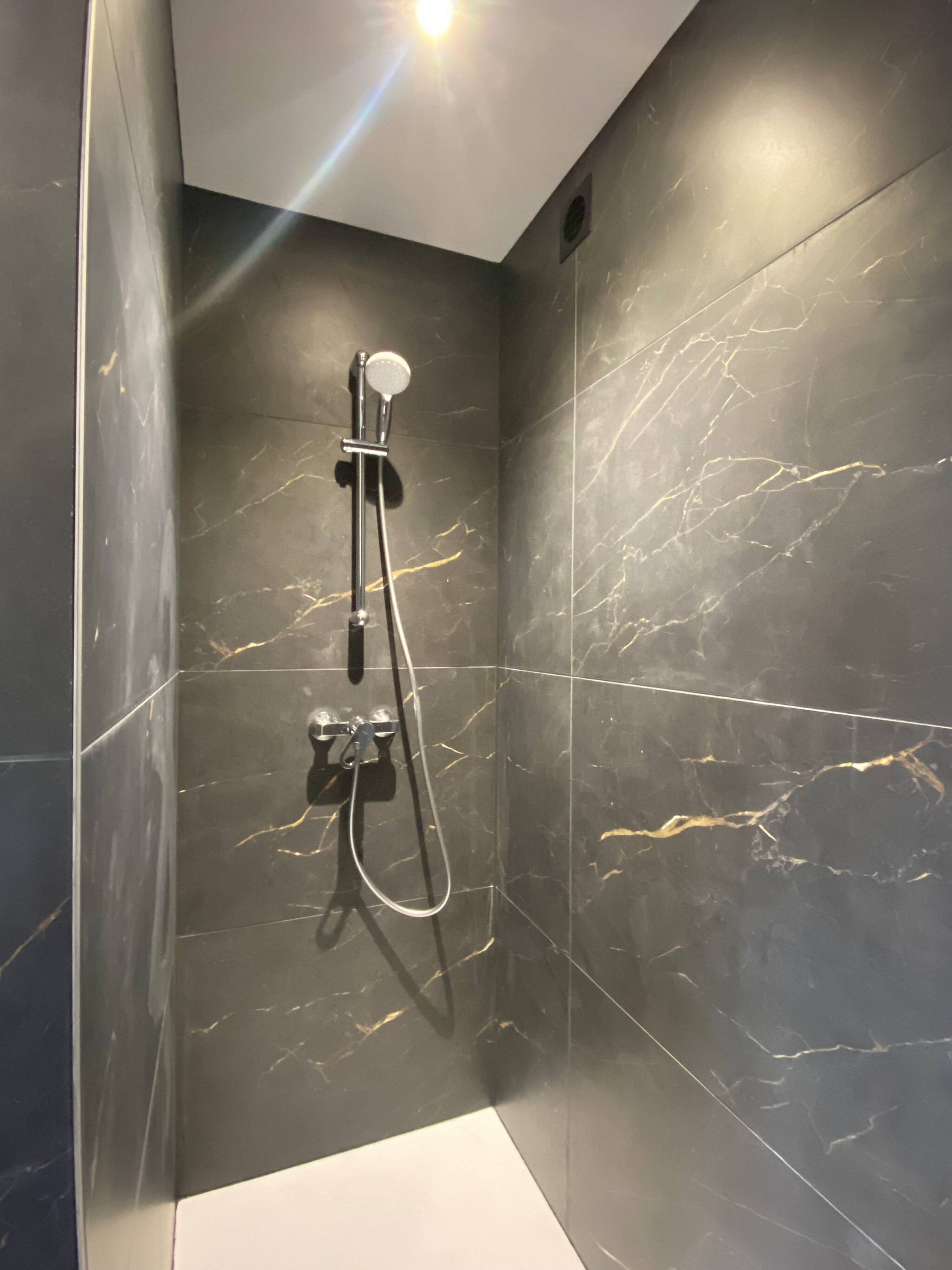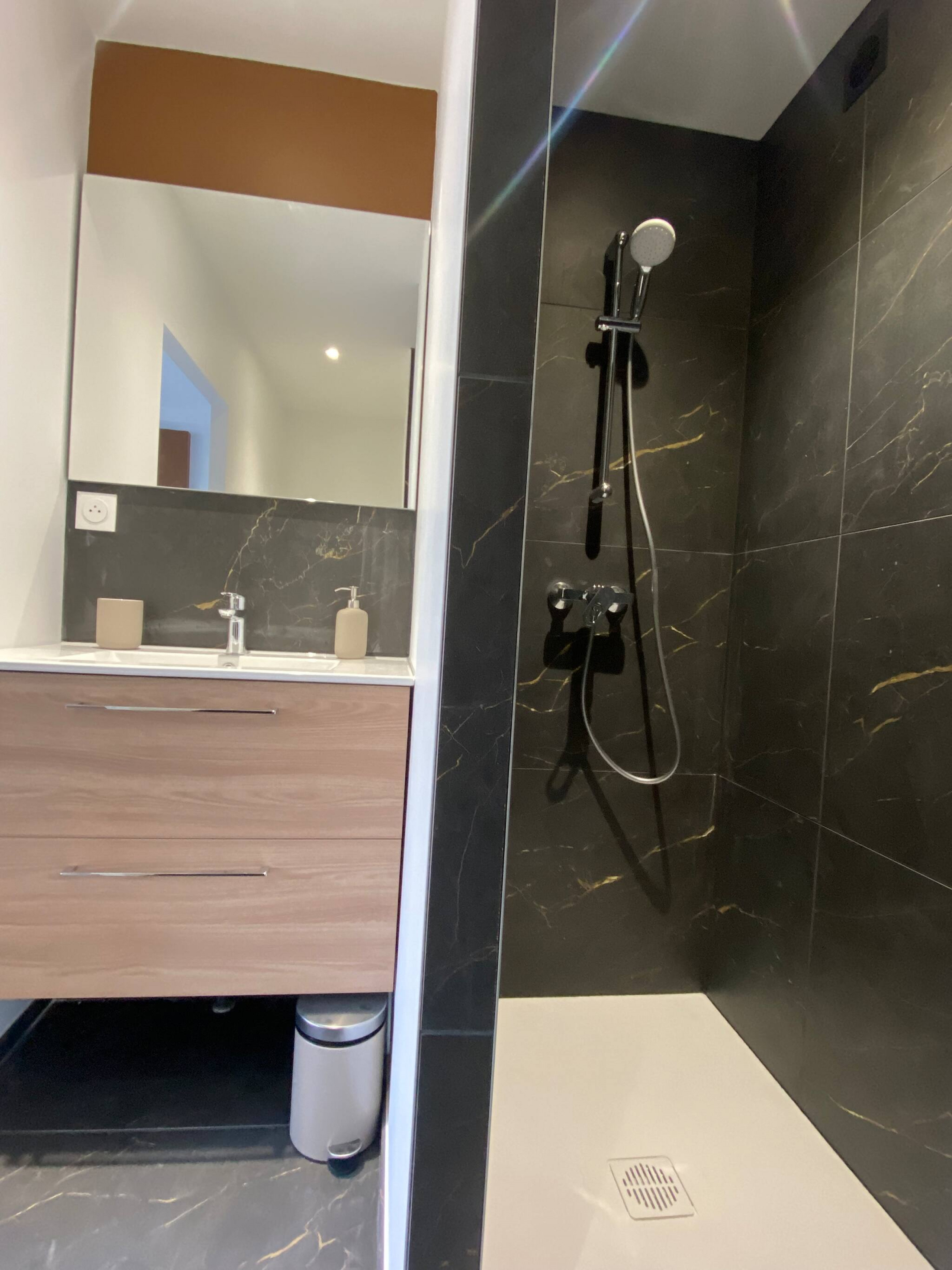 La salle de bains comprend une douche, un meuble vasque, un miroir, des rangements. Des produits d’hygiène sont mis à disposition.