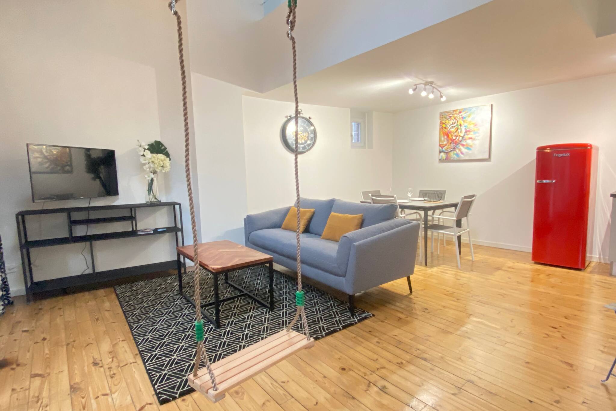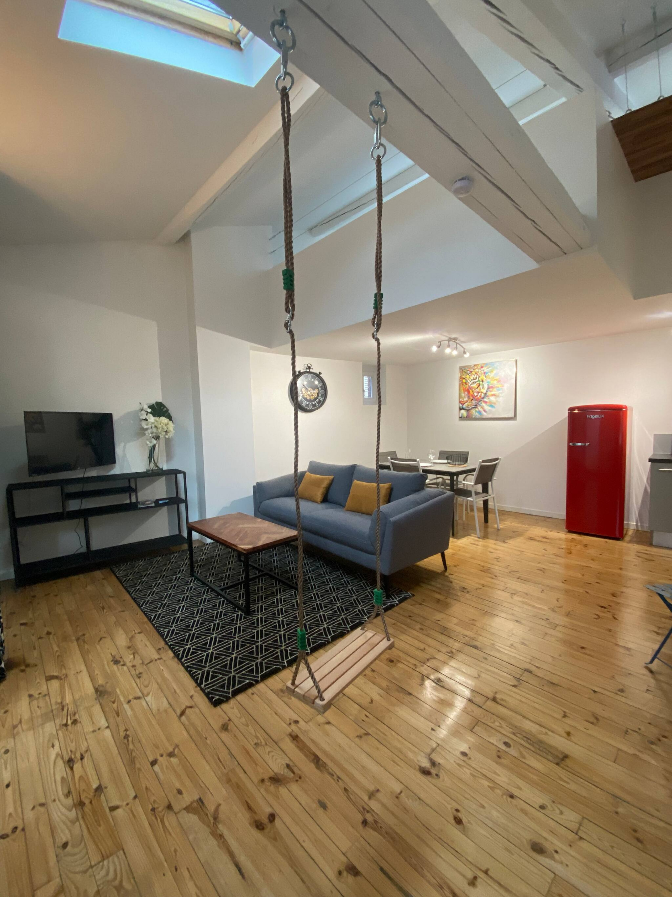 - un salon cosy et original avec un grand canapé et une balançoire pour se détendre ;