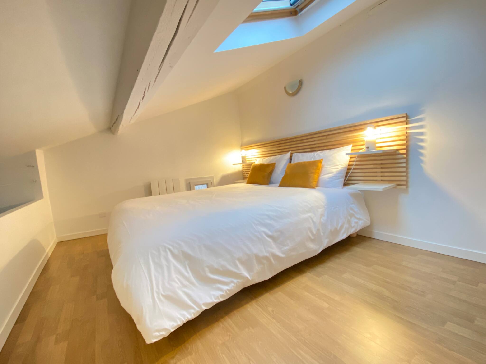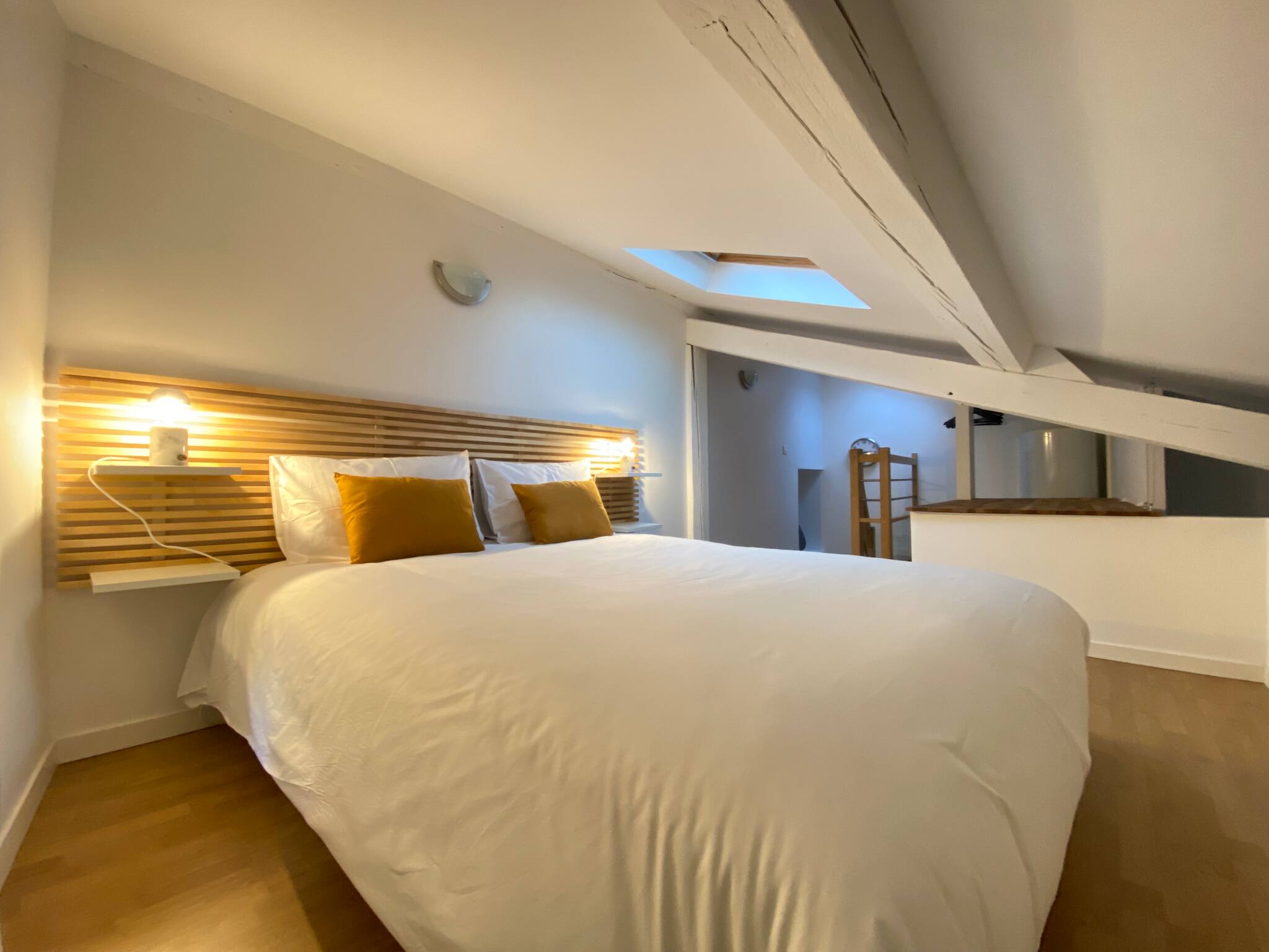 - une chambre mansardée aménagée sous les combles avec un grand lit queen size pour des nuits de sommeil divin ;