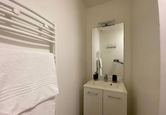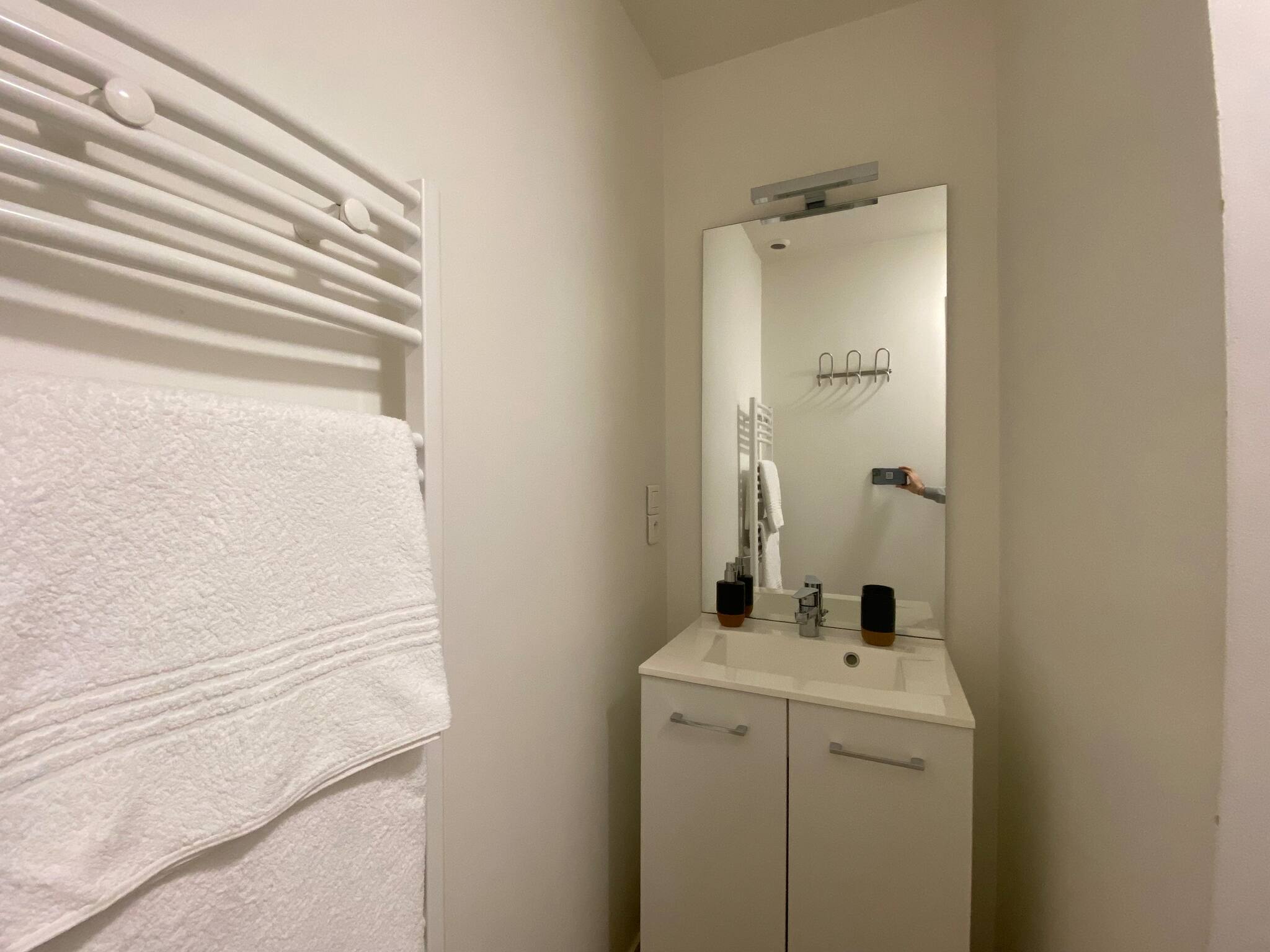 - une salle de bains propre avec cabine de douche et sèche-serviettes ;