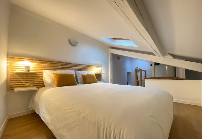 - La chambre est accessible par un escalier façon meunier, apportant une note d’authenticité à l’appartement. Cet accès n’est cependant pas idéal pour les enfants en bas âge ou les personnes âgées.