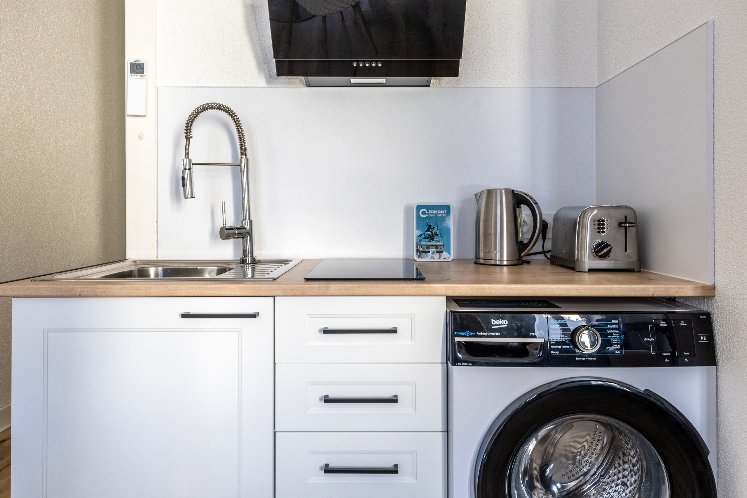 🍽️ La cuisine ouverte est entièrement équipée avec réfrigérateur et congélateur, plaques à induction, micro-ondes, cafetière, bouilloire et grille-pain, ainsi que la vaisselle et les ustensiles nécessaires pour cuisiner facilement.