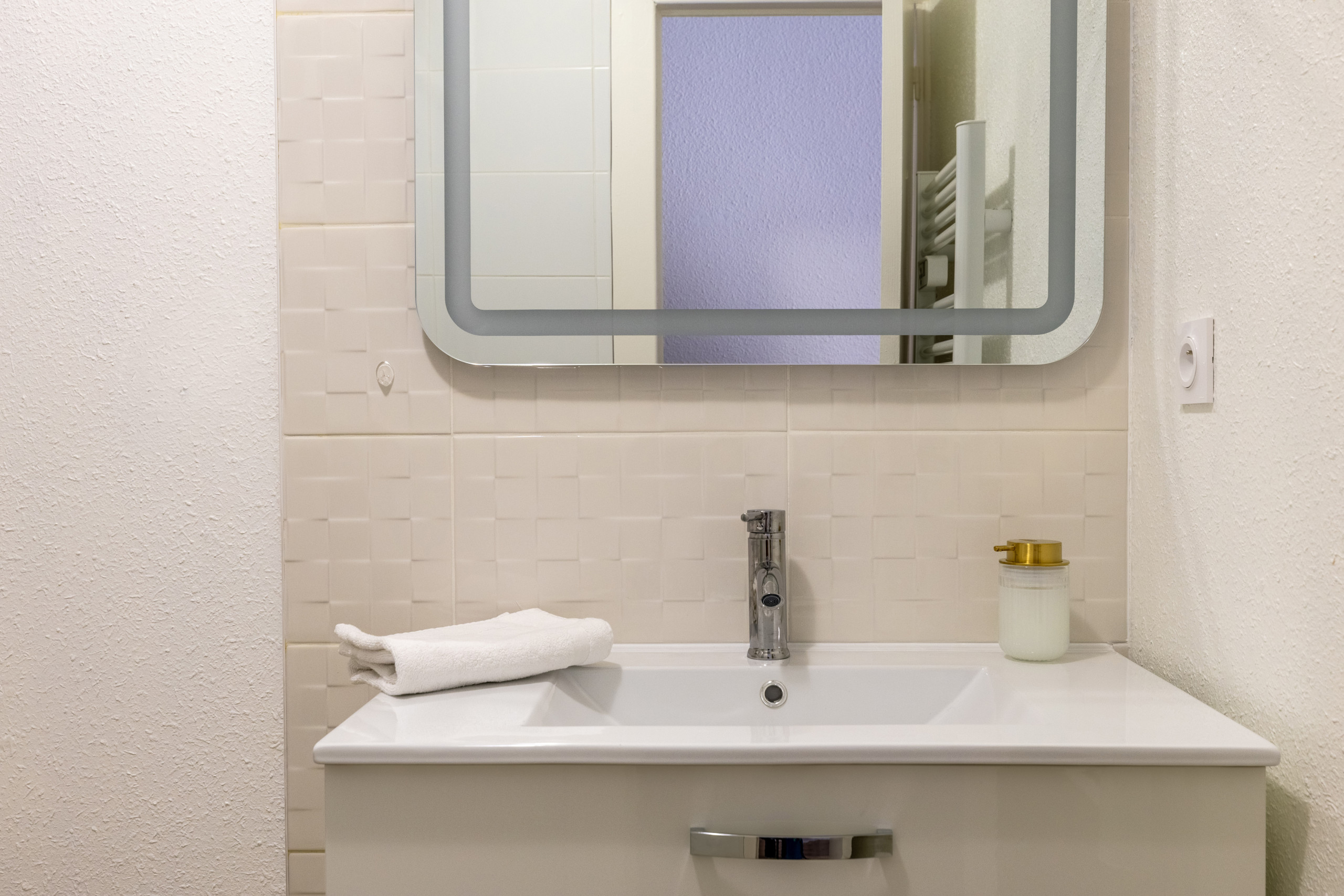 Elle est équipée d’une douche à l’italienne, d’un meuble vasque et d’un grand miroir. L’espace se révèle fonctionnel pour les voyageurs d’affaires souhaitant se rafraîchir. Les couples et les familles, quant à eux, y voient un coin intime et soigné.