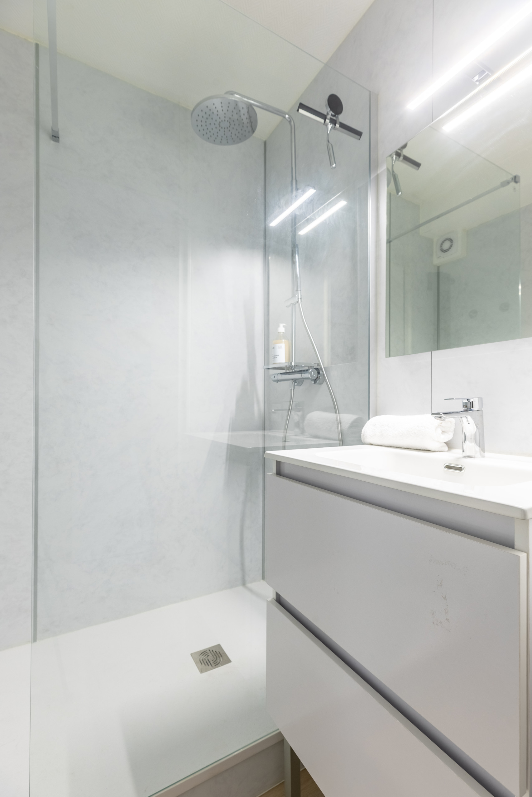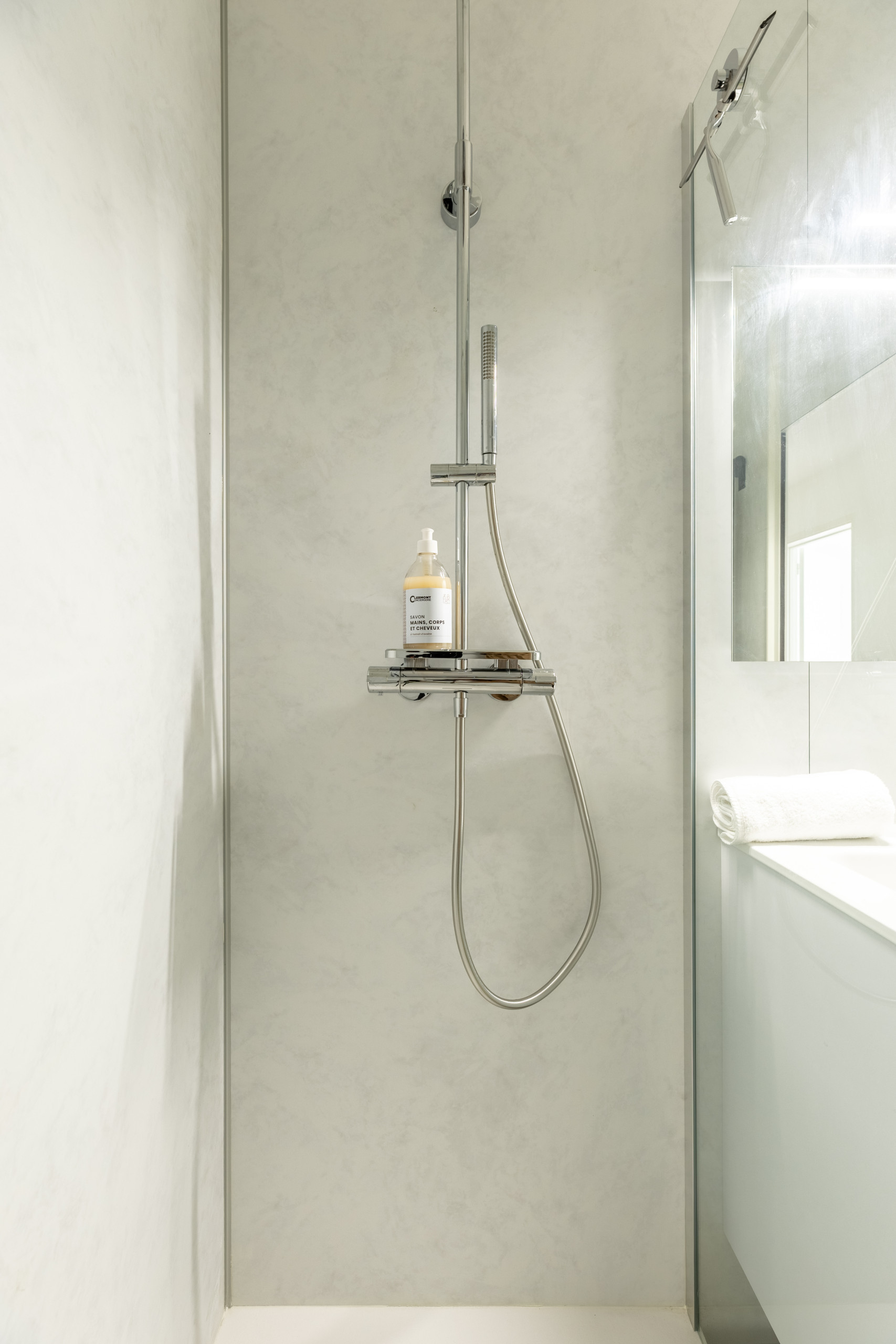 - une salle de bains avec une belle cabine de douche d’où jaillissent des vapeurs d’eau chaudes dignes d’un spa ;