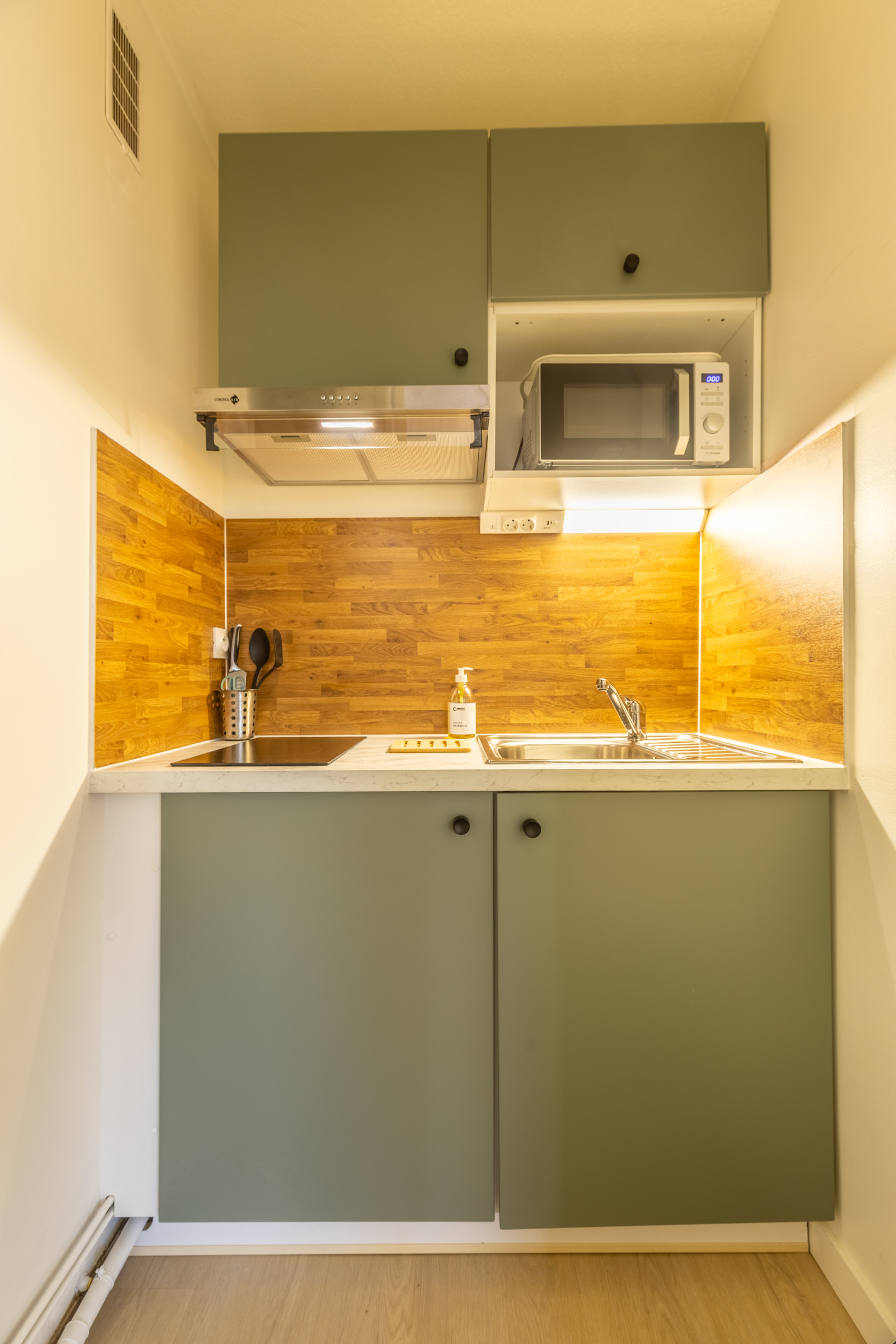 Avec plaque de cuisson, four intégré et verres à vin, vous retrouvez le goût de cuisiner des petits plats sains. Le micro-ondes est votre compagnon précieux pour réchauffer un plat express entre deux sorties. Et le lave-vaisselle évite de passer par la case nettoyage après chaque repas.