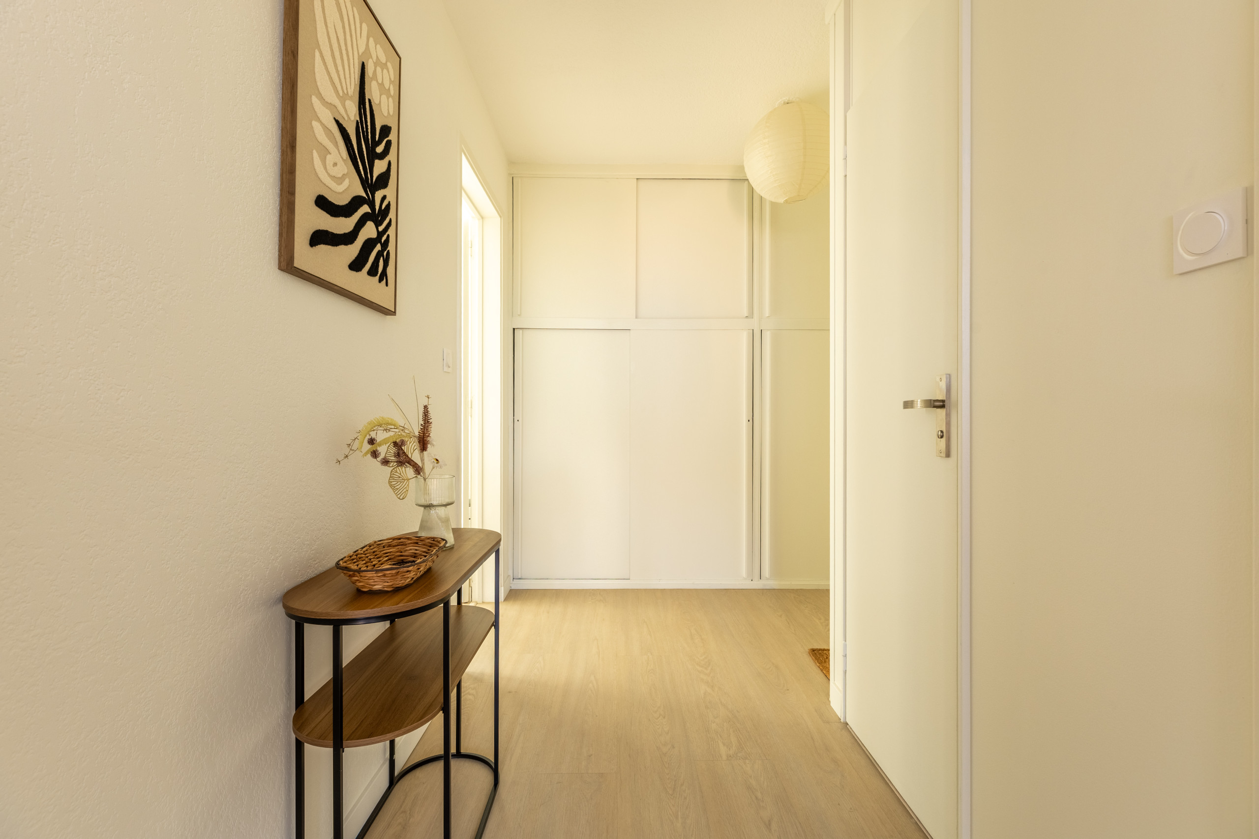 Couloir avec espace de rangement et vide-poche pratique.