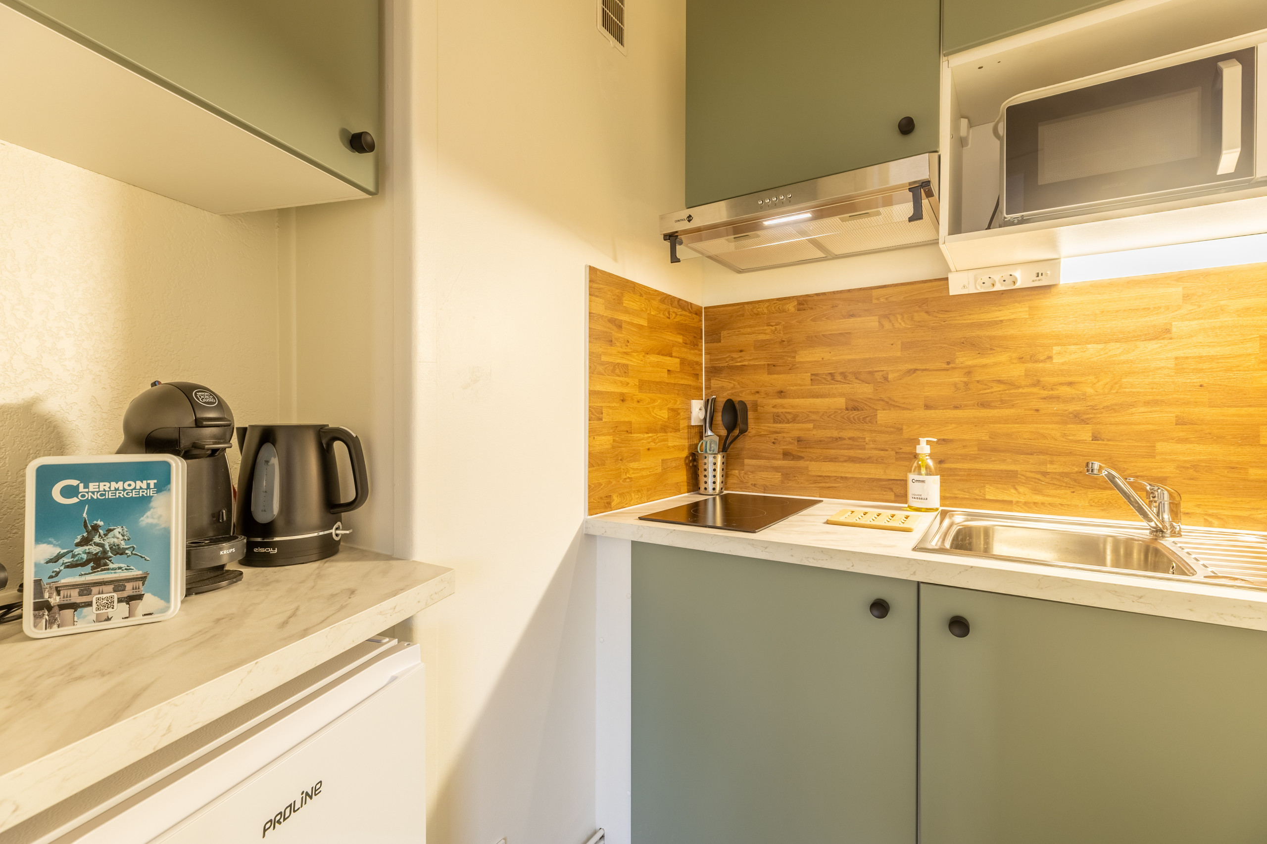Des éléments de courtoisie sont disponibles (dosettes de café TASSIMO, thé, huile vinaigre, sel, poivre) et les consommables pour vos premiers jours dans l’appartement papier toilette, éponge, sac poubelle, produits d’entretien écologique.