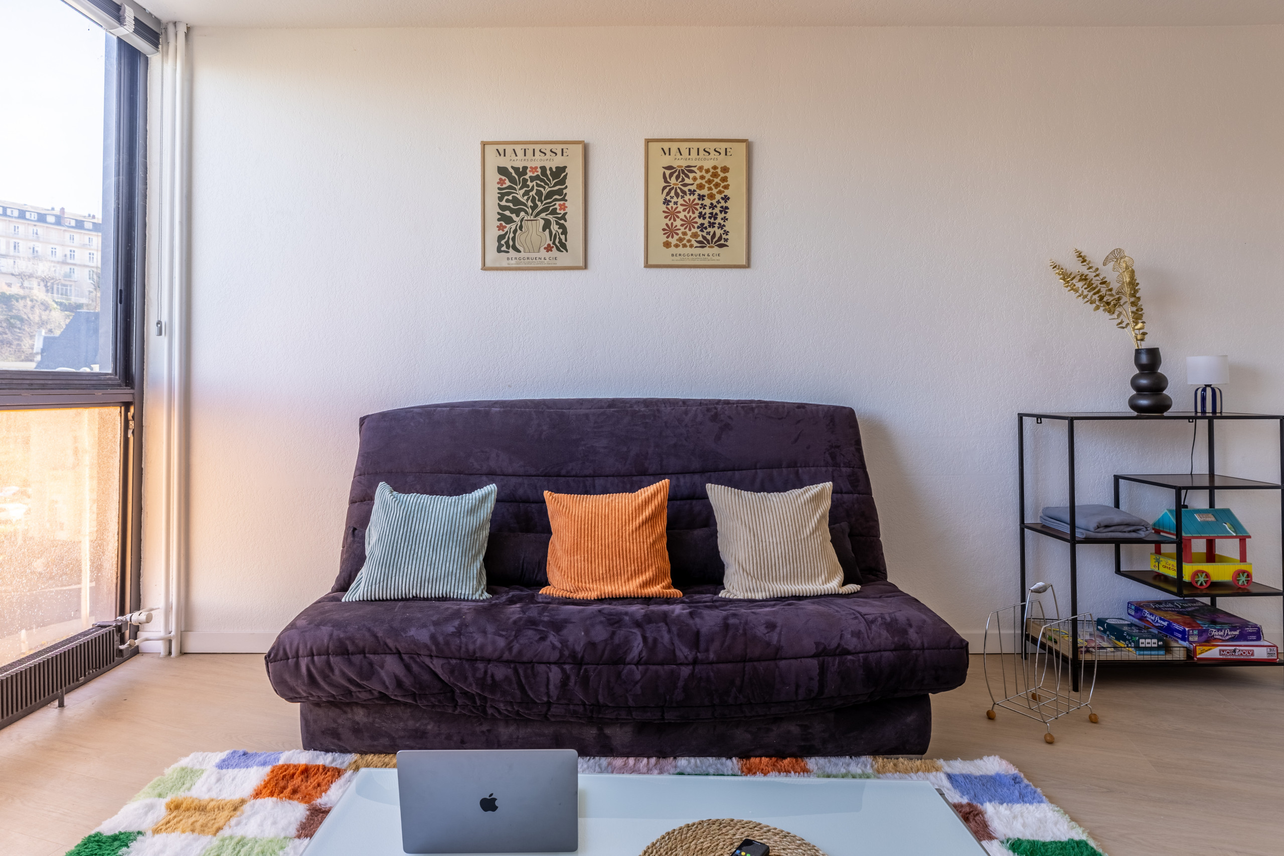 Avec sa grande fenêtre, le salon est baigné de lumière naturelle. Associée au sol parqueté, l’ensemble vous plonge dans une atmosphère chaleureuse, terriblement réconfortante. La version colorée de la Joconde ajoute une touche artistique. Son style audacieux ne manque pas de surprendre. Aussi, elle offre une perspective rafraîchissante sur l’art. Quand vous croisez son regard, inévitablement, un sourire se dessine sur votre visage.