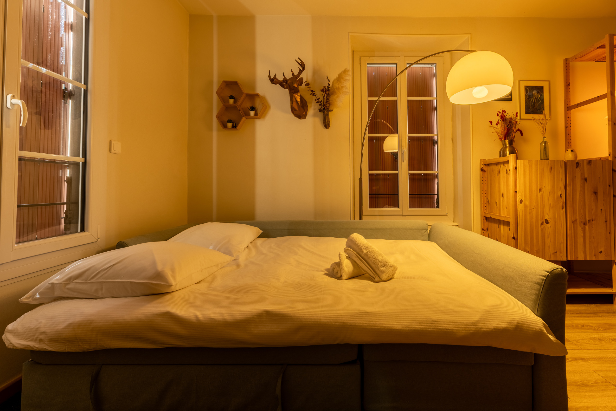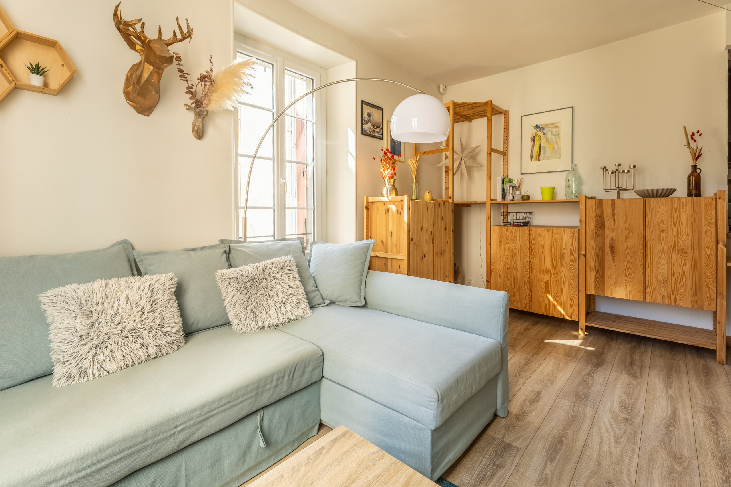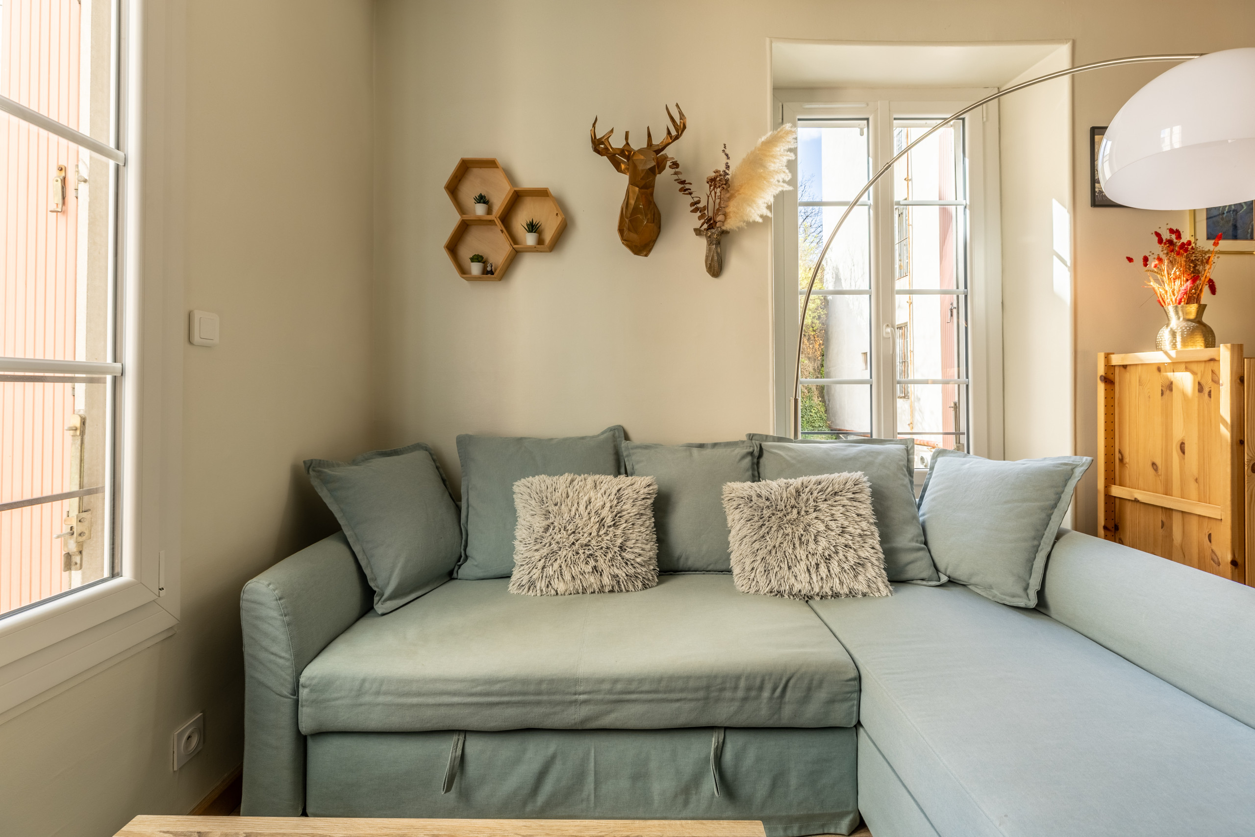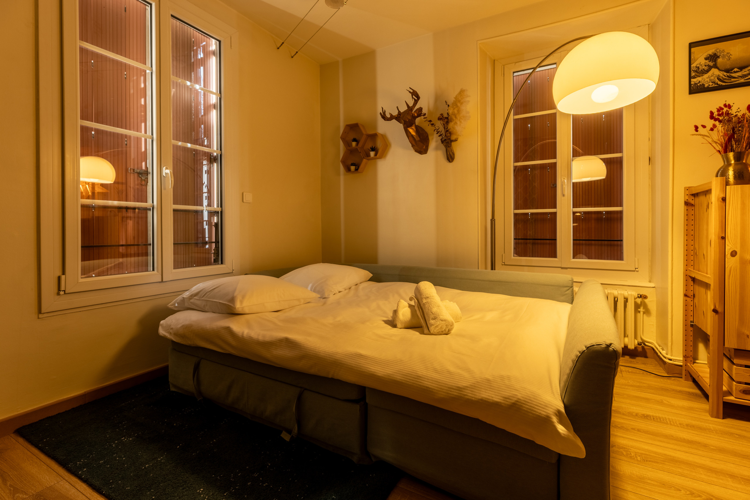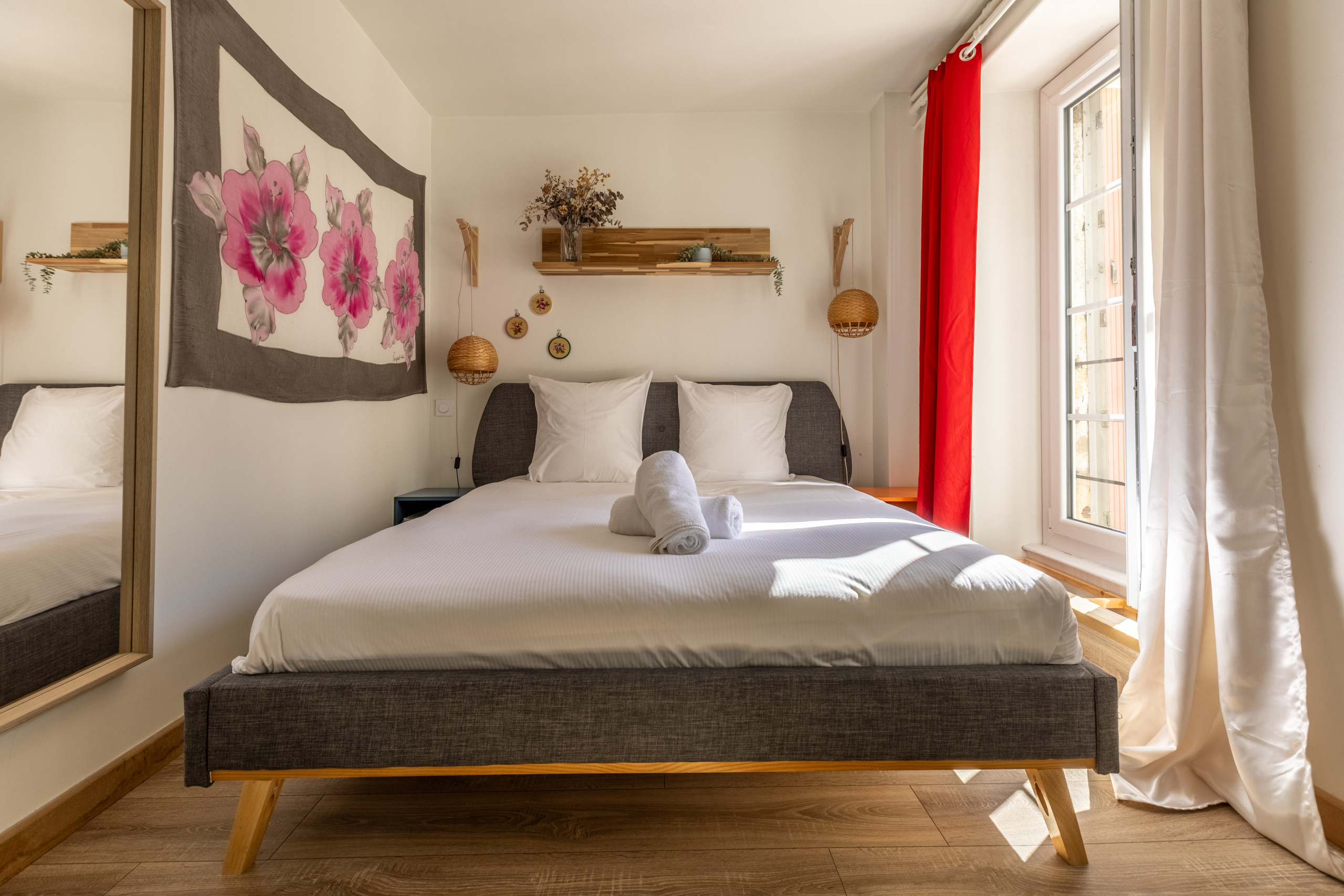 Ce logement cosy offre un espace de vie moderne et entièrement équipé. La chambre principale dispose d'un lit queen size confortable, complétée par un canapé-lit convertible, permettant d'accueillir jusqu'à 4 personnes.